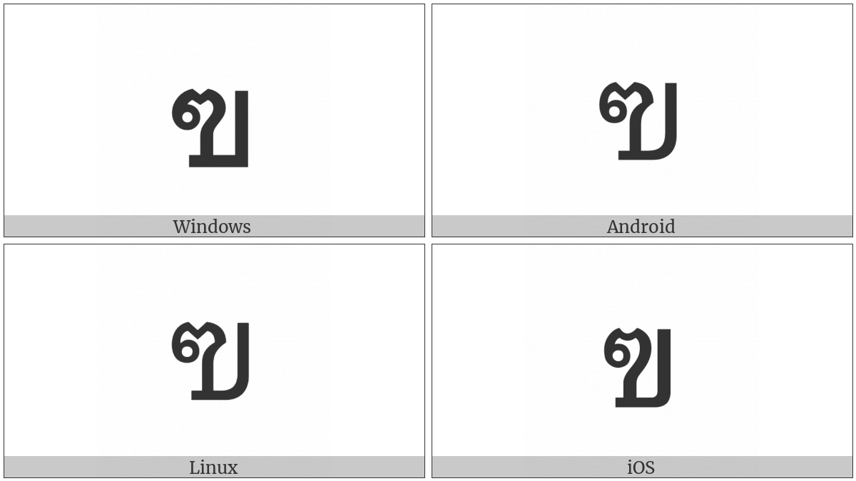 The image below shows how the “Thai Character Kho Khuat” symbol might look like on different operating systems. If the font in which this web site is displayed does not contain the symbol and there is no fallback font able to render it, you can use the image below to get an idea of what it should look like.