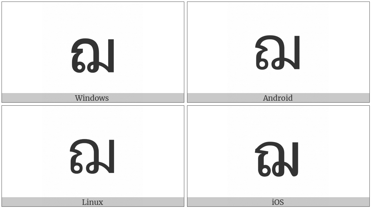The image below shows how the “Thai Character Cho Choe” symbol might look like on different operating systems. If the font in which this web site is displayed does not contain the symbol and there is no fallback font able to render it, you can use the image below to get an idea of what it should look like.