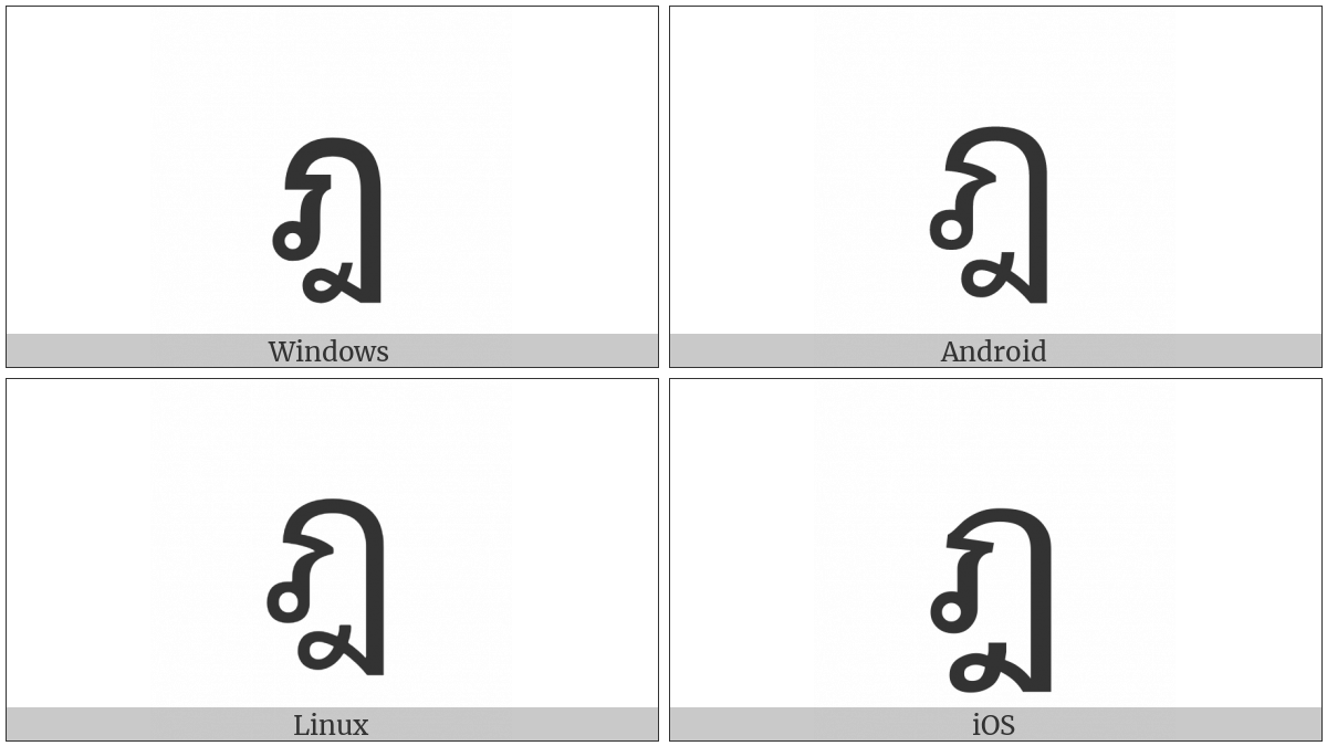 The image below shows how the “Thai Character Do Chada” symbol might look like on different operating systems. If the font in which this web site is displayed does not contain the symbol and there is no fallback font able to render it, you can use the image below to get an idea of what it should look like.