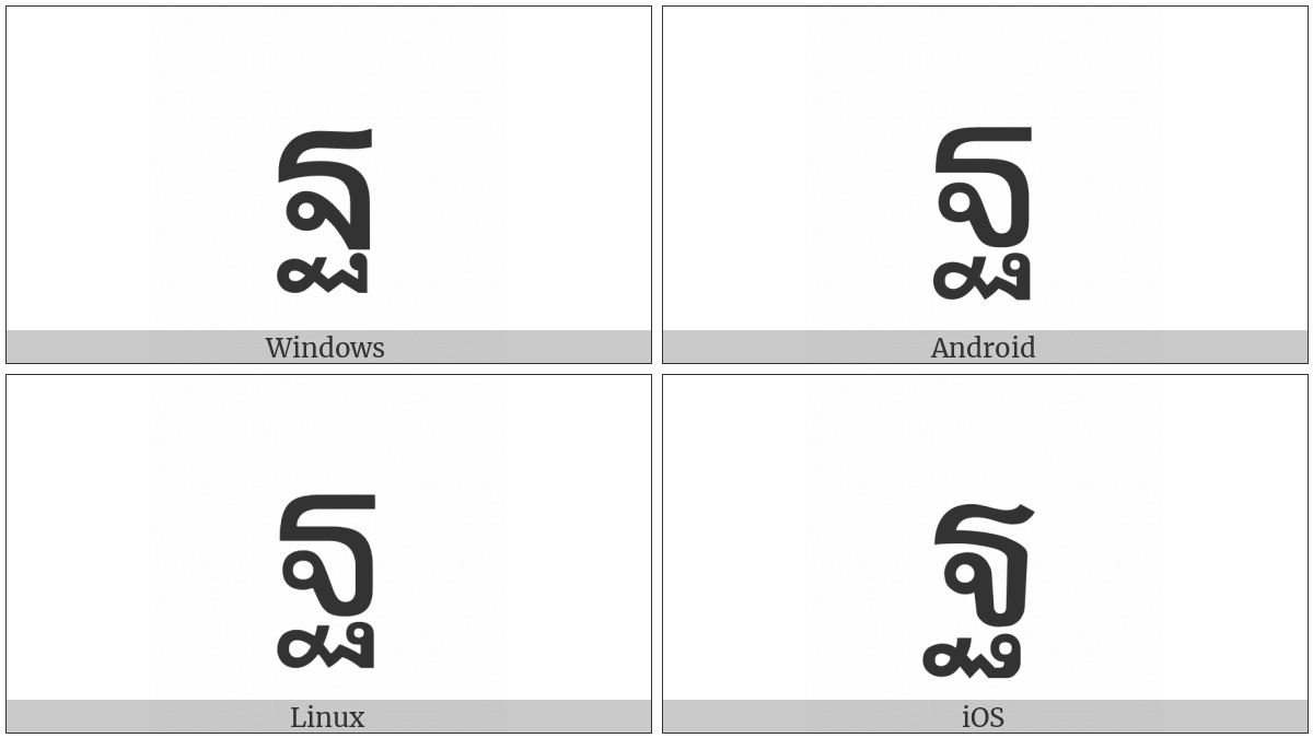 The image below shows how the “Thai Character Tho Than” symbol might look like on different operating systems. If the font in which this web site is displayed does not contain the symbol and there is no fallback font able to render it, you can use the image below to get an idea of what it should look like.