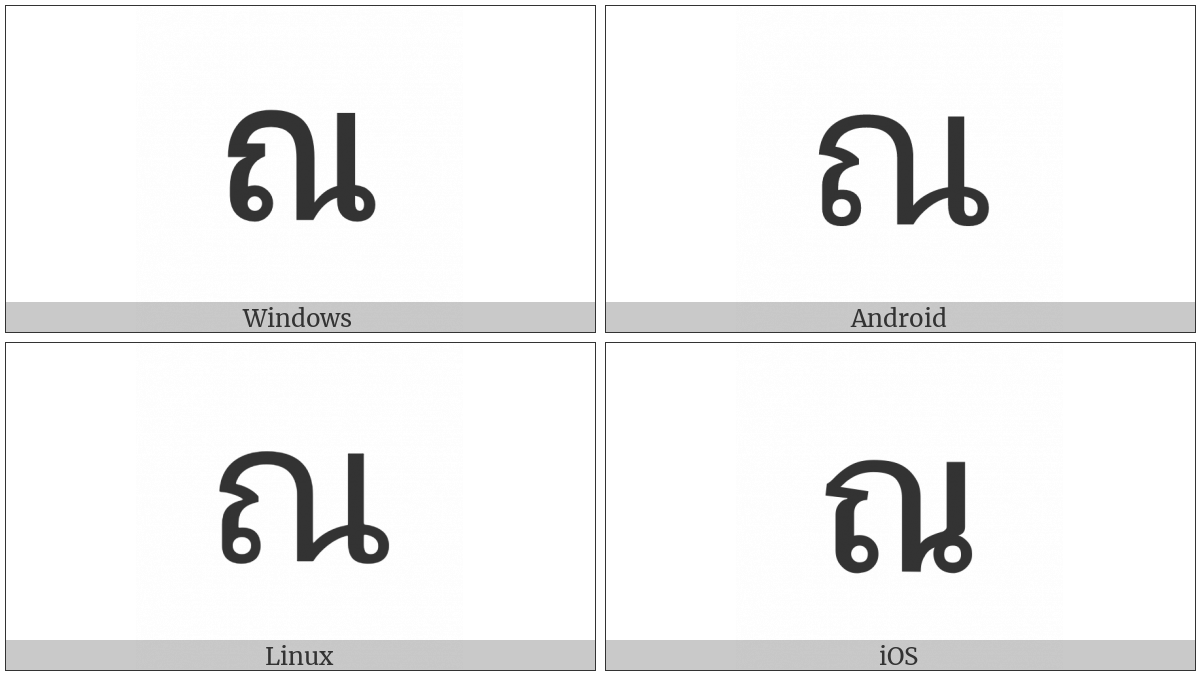The image below shows how the “Thai Character No Nen” symbol might look like on different operating systems. If the font in which this web site is displayed does not contain the symbol and there is no fallback font able to render it, you can use the image below to get an idea of what it should look like.