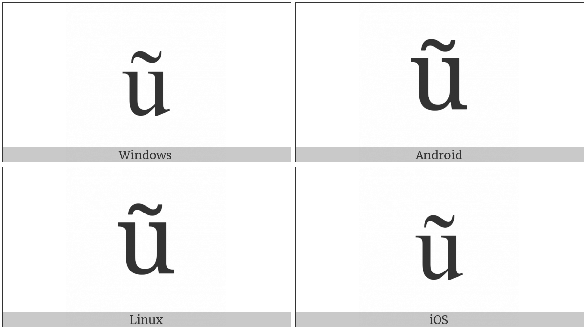 The image below shows how the “Latin Small Letter U With Tilde” symbol might look like on different operating systems. If the font in which this web site is displayed does not contain the symbol and there is no fallback font able to render it, you can use the image below to get an idea of what it should look like.