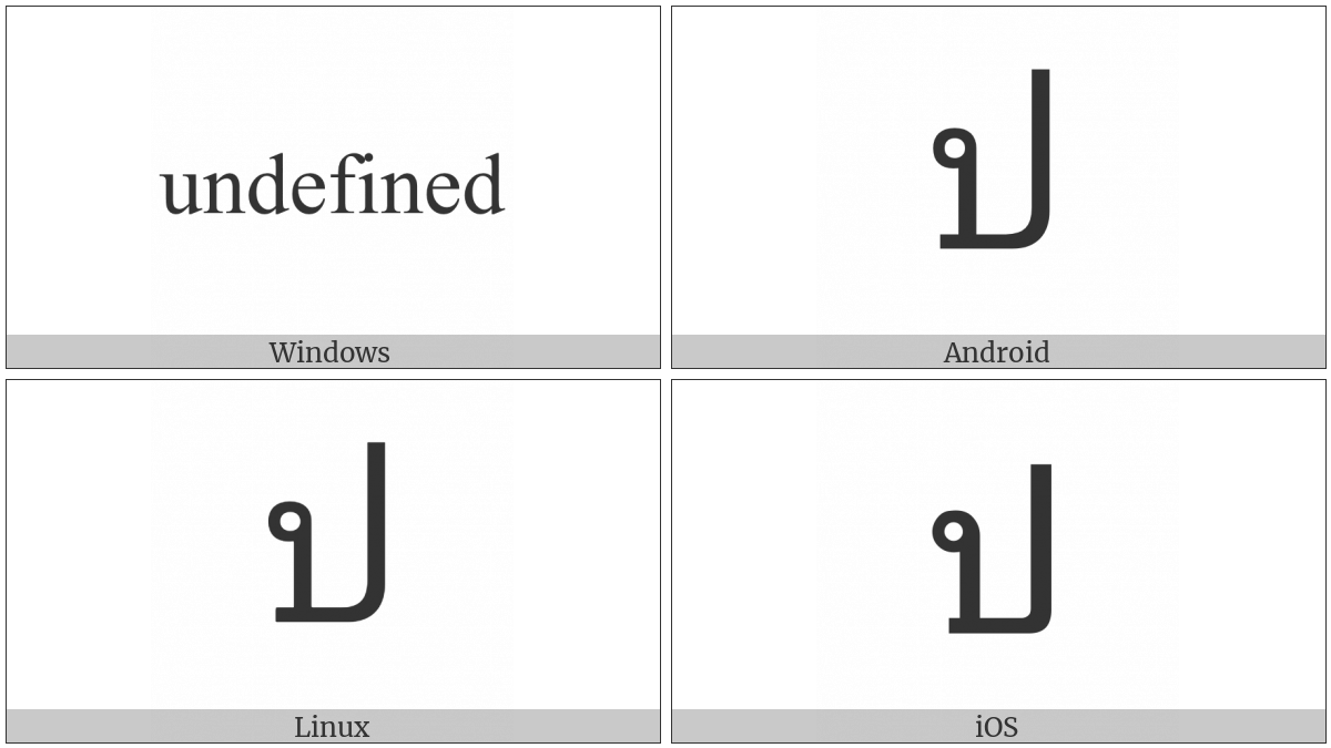The image below shows how the “Thai Character Po Pla” symbol might look like on different operating systems. If the font in which this web site is displayed does not contain the symbol and there is no fallback font able to render it, you can use the image below to get an idea of what it should look like.