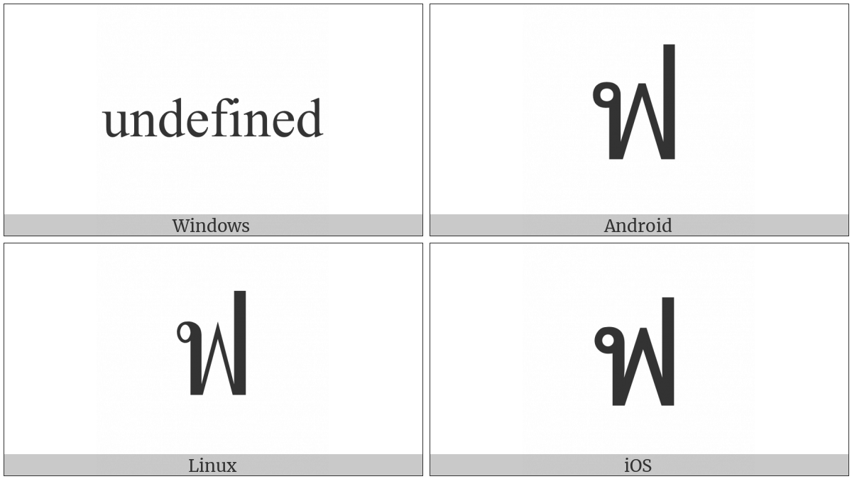 The image below shows how the “Thai Character Fo Fan” symbol might look like on different operating systems. If the font in which this web site is displayed does not contain the symbol and there is no fallback font able to render it, you can use the image below to get an idea of what it should look like.