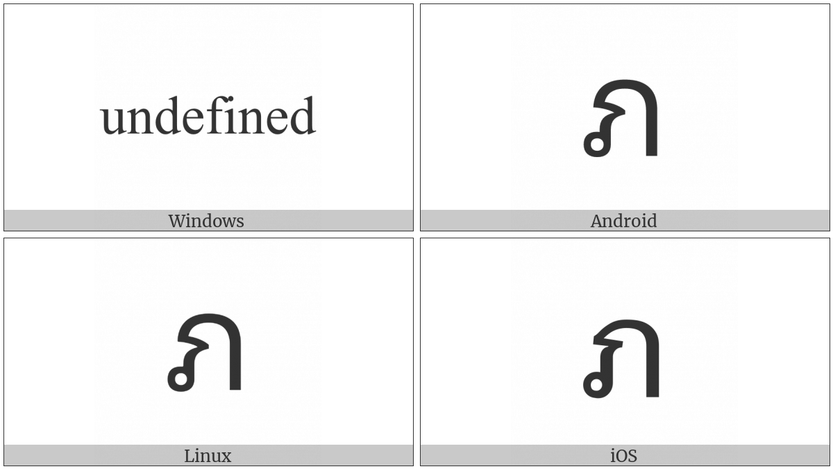 The image below shows how the “Thai Character Pho Samphao” symbol might look like on different operating systems. If the font in which this web site is displayed does not contain the symbol and there is no fallback font able to render it, you can use the image below to get an idea of what it should look like.
