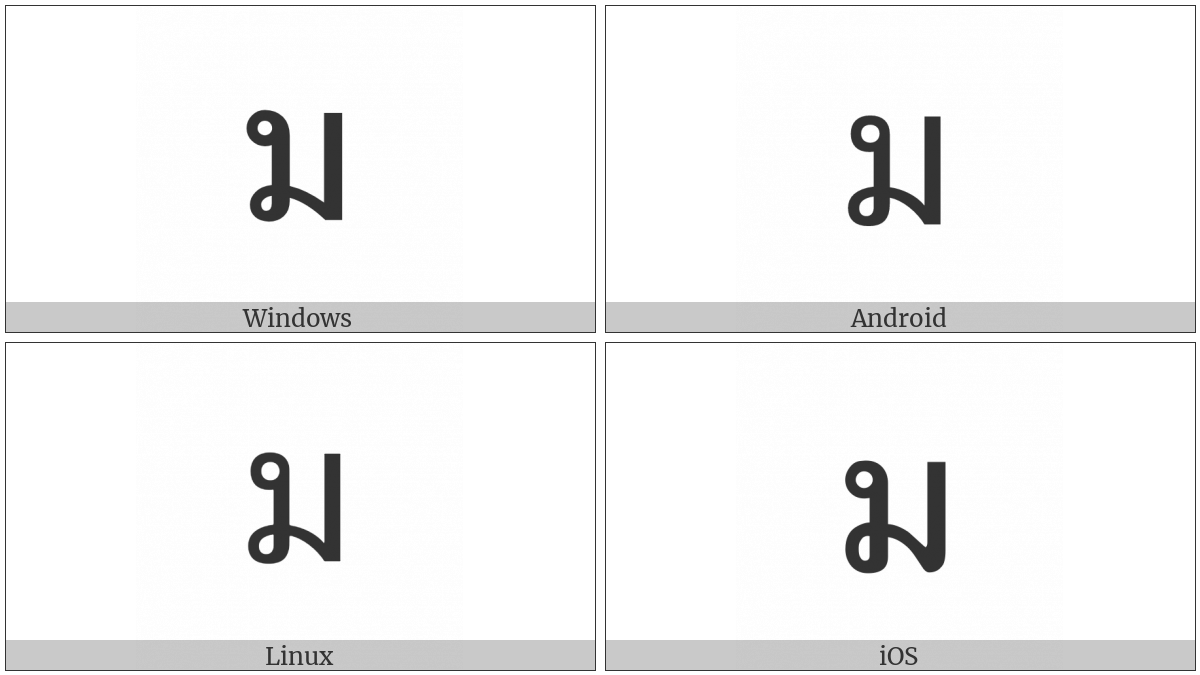 The image below shows how the “Thai Character Mo Ma” symbol might look like on different operating systems. If the font in which this web site is displayed does not contain the symbol and there is no fallback font able to render it, you can use the image below to get an idea of what it should look like.