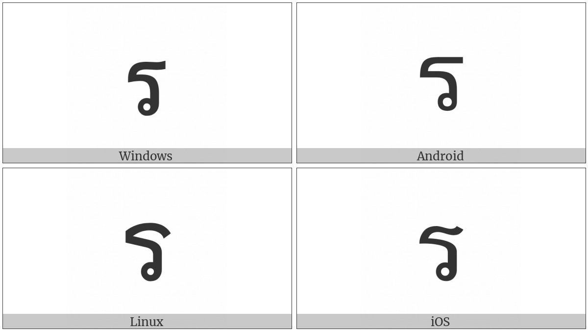 The image below shows how the “Thai Character Ro Rua” symbol might look like on different operating systems. If the font in which this web site is displayed does not contain the symbol and there is no fallback font able to render it, you can use the image below to get an idea of what it should look like.