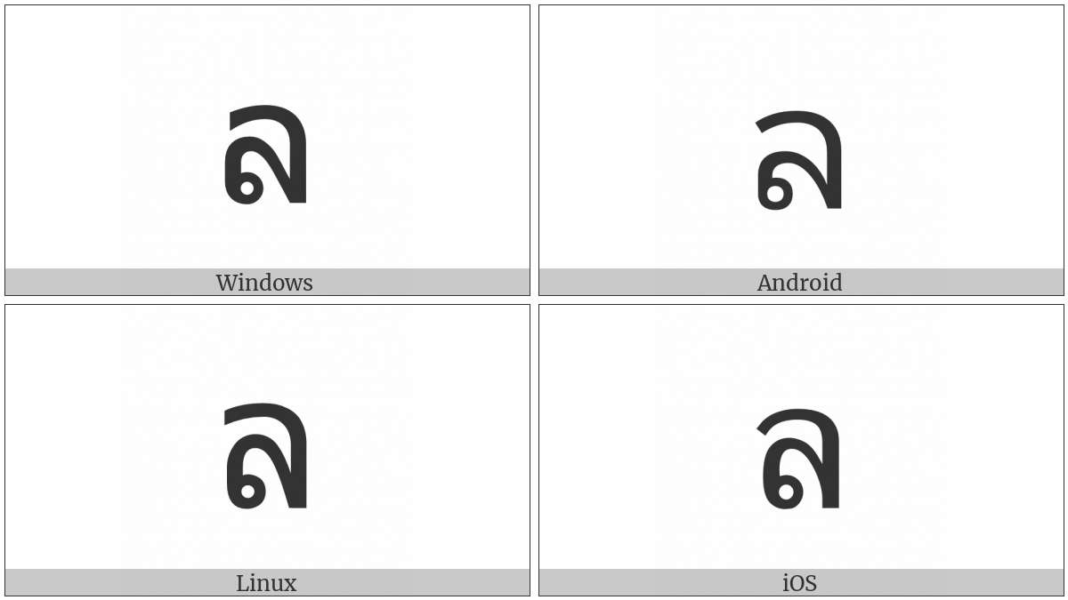 The image below shows how the “Thai Character Lo Ling” symbol might look like on different operating systems. If the font in which this web site is displayed does not contain the symbol and there is no fallback font able to render it, you can use the image below to get an idea of what it should look like.