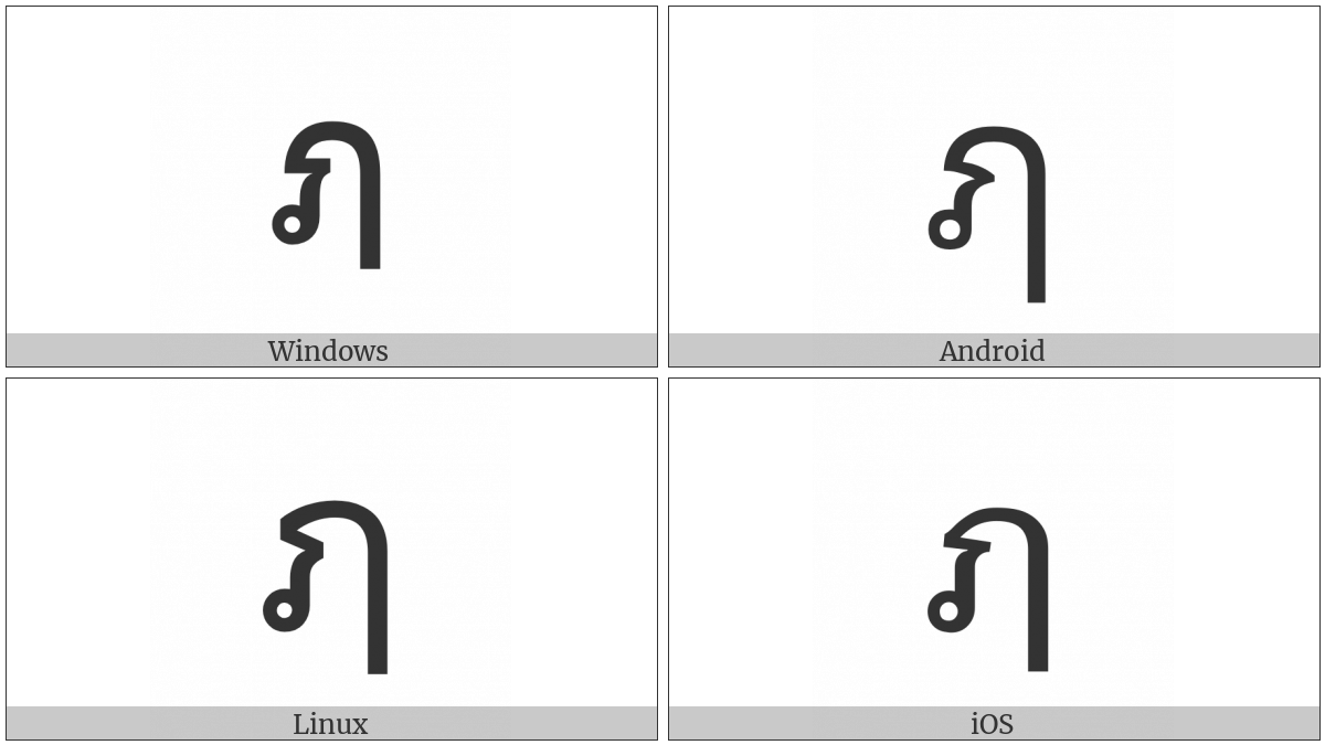 The image below shows how the “Thai Character Lu” symbol might look like on different operating systems. If the font in which this web site is displayed does not contain the symbol and there is no fallback font able to render it, you can use the image below to get an idea of what it should look like.