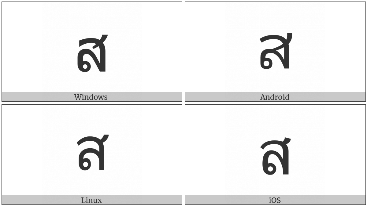 The image below shows how the “Thai Character So Sua” symbol might look like on different operating systems. If the font in which this web site is displayed does not contain the symbol and there is no fallback font able to render it, you can use the image below to get an idea of what it should look like.