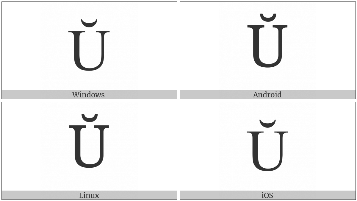 The image below shows how the “Latin Capital Letter U With Breve” symbol might look like on different operating systems. If the font in which this web site is displayed does not contain the symbol and there is no fallback font able to render it, you can use the image below to get an idea of what it should look like.