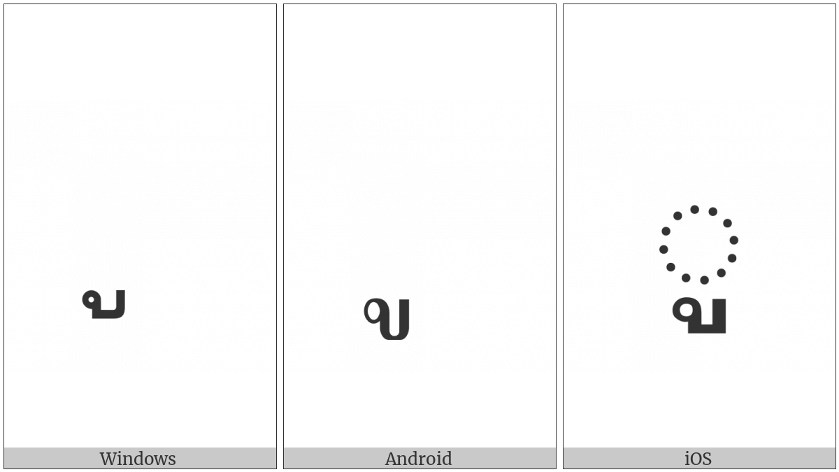 The image below shows how the “Thai Character Sara Uu” symbol might look like on different operating systems. If the font in which this web site is displayed does not contain the symbol and there is no fallback font able to render it, you can use the image below to get an idea of what it should look like.