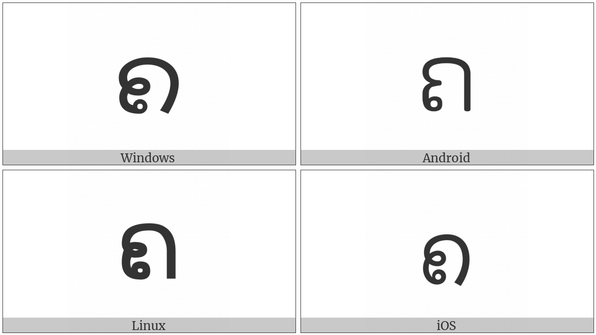 The image below shows how the “Lao Letter Kho Tam” symbol might look like on different operating systems. If the font in which this web site is displayed does not contain the symbol and there is no fallback font able to render it, you can use the image below to get an idea of what it should look like.