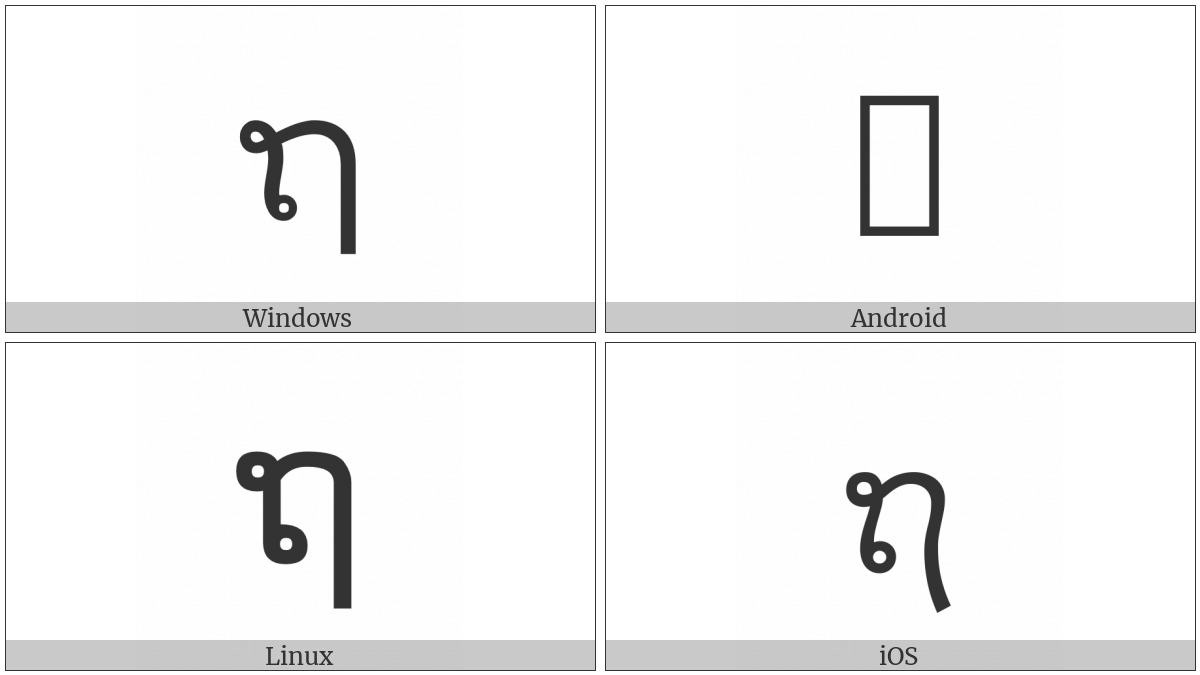The image below shows how the “Lao Letter Tho Sung” symbol might look like on different operating systems. If the font in which this web site is displayed does not contain the symbol and there is no fallback font able to render it, you can use the image below to get an idea of what it should look like.