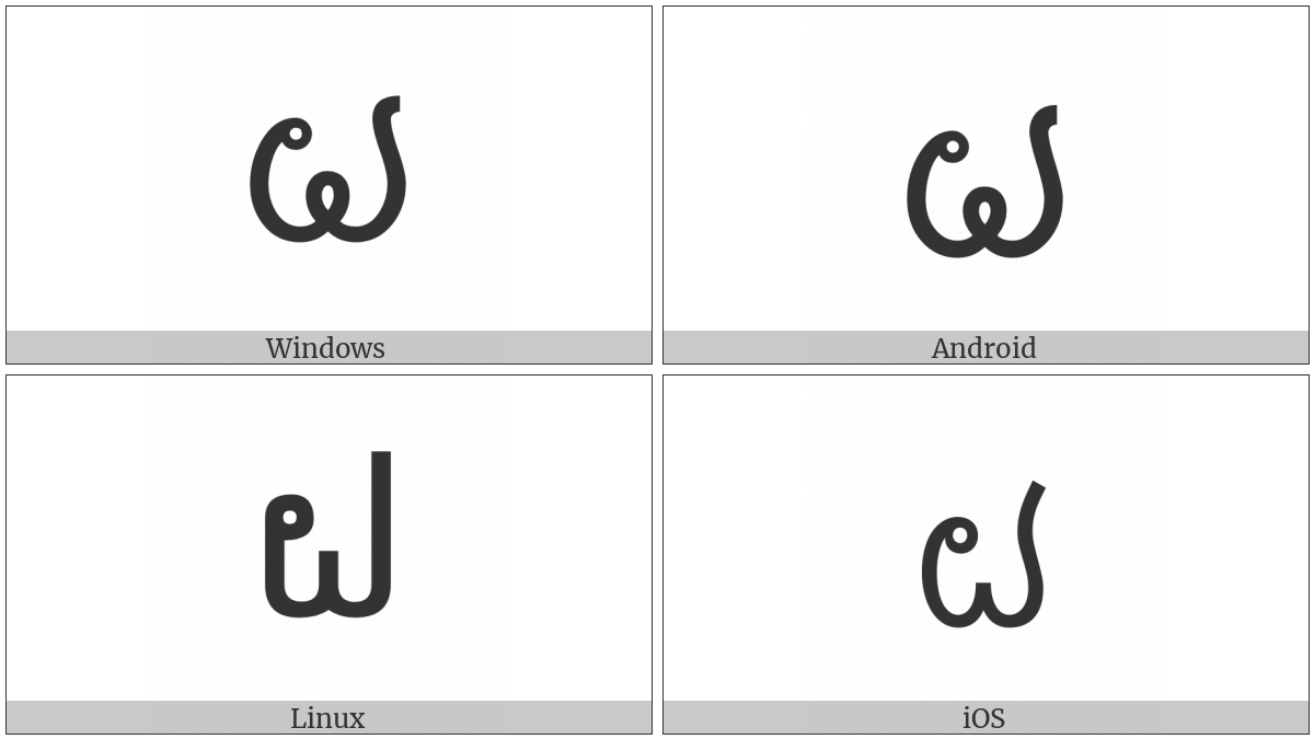 The image below shows how the “Lao Letter Fo Tam” symbol might look like on different operating systems. If the font in which this web site is displayed does not contain the symbol and there is no fallback font able to render it, you can use the image below to get an idea of what it should look like.