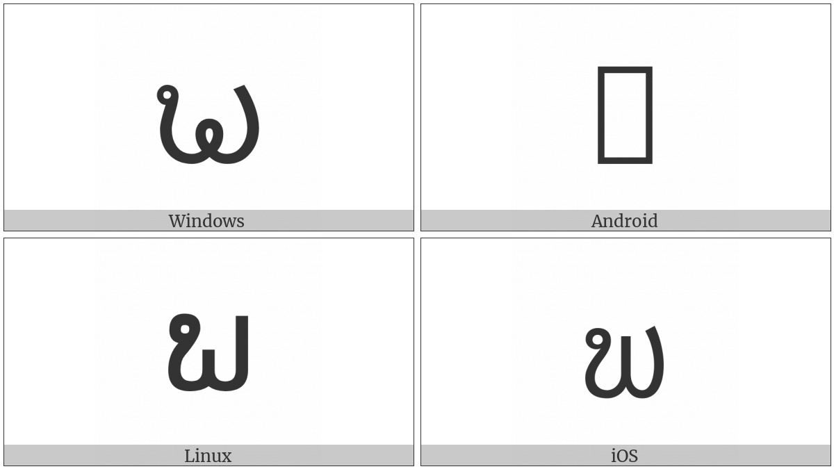 The image below shows how the “Lao Letter Pho Tam” symbol might look like on different operating systems. If the font in which this web site is displayed does not contain the symbol and there is no fallback font able to render it, you can use the image below to get an idea of what it should look like.