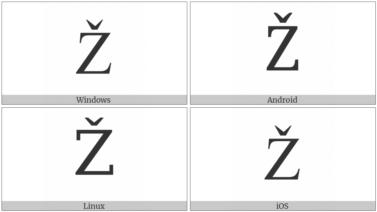 The image below shows how the “Latin Capital Letter Z With Caron” symbol might look like on different operating systems. If the font in which this web site is displayed does not contain the symbol and there is no fallback font able to render it, you can use the image below to get an idea of what it should look like.