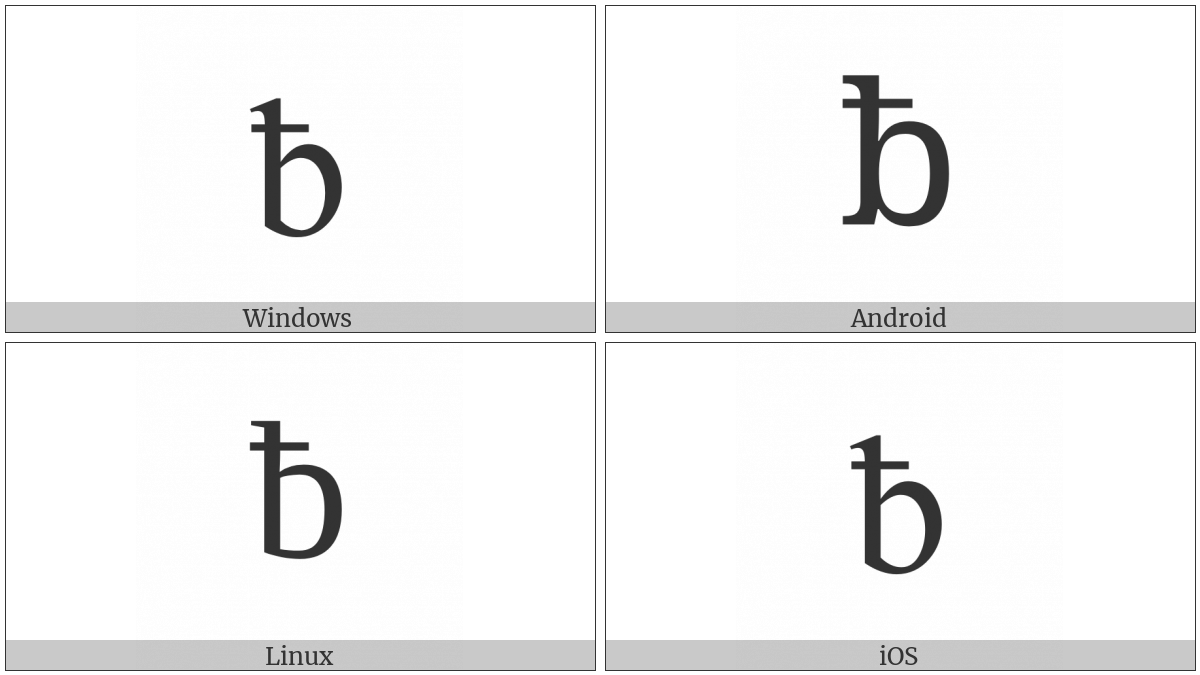 The image below shows how the “Latin Small Letter B With Stroke” symbol might look like on different operating systems. If the font in which this web site is displayed does not contain the symbol and there is no fallback font able to render it, you can use the image below to get an idea of what it should look like.