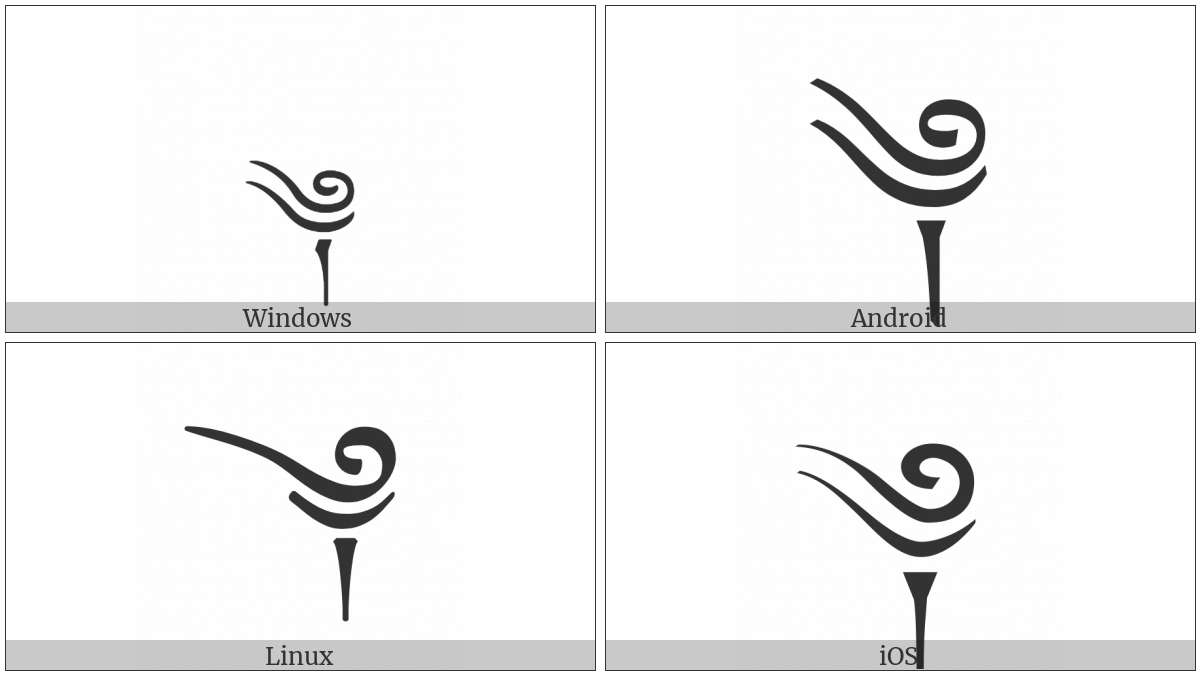 The image below shows how the “Tibetan Mark Caret Yig Mgo Phur Shad Ma” symbol might look like on different operating systems. If the font in which this web site is displayed does not contain the symbol and there is no fallback font able to render it, you can use the image below to get an idea of what it should look like.