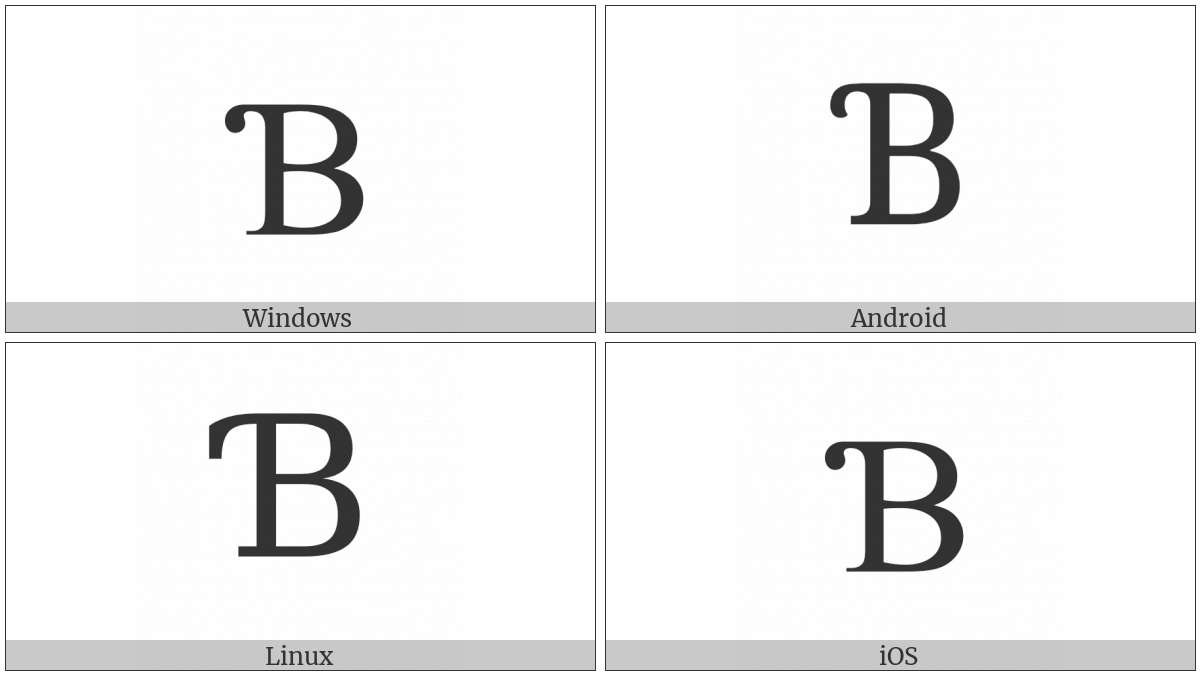 The image below shows how the “Latin Capital Letter B With Hook” symbol might look like on different operating systems. If the font in which this web site is displayed does not contain the symbol and there is no fallback font able to render it, you can use the image below to get an idea of what it should look like.