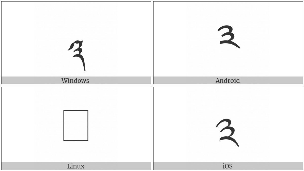 The image below shows how the “Tibetan Digit Three” symbol might look like on different operating systems. If the font in which this web site is displayed does not contain the symbol and there is no fallback font able to render it, you can use the image below to get an idea of what it should look like.