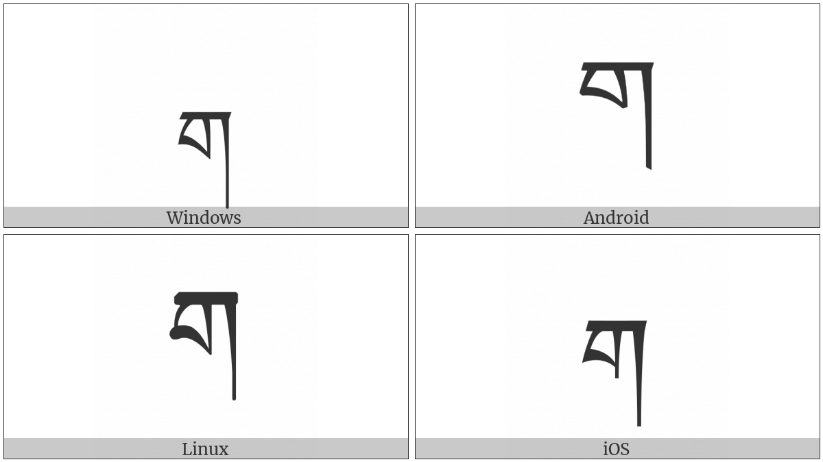 The image below shows how the “Tibetan Letter Ga” symbol might look like on different operating systems. If the font in which this web site is displayed does not contain the symbol and there is no fallback font able to render it, you can use the image below to get an idea of what it should look like.