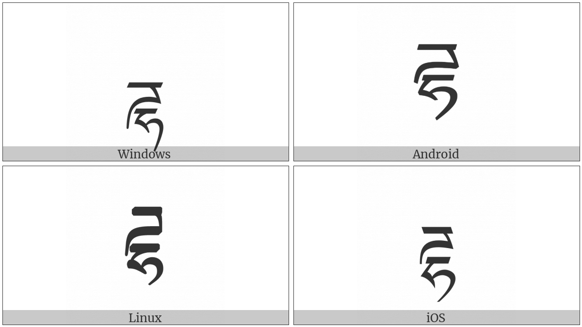 The image below shows how the “Tibetan Letter Ddha” symbol might look like on different operating systems. If the font in which this web site is displayed does not contain the symbol and there is no fallback font able to render it, you can use the image below to get an idea of what it should look like.