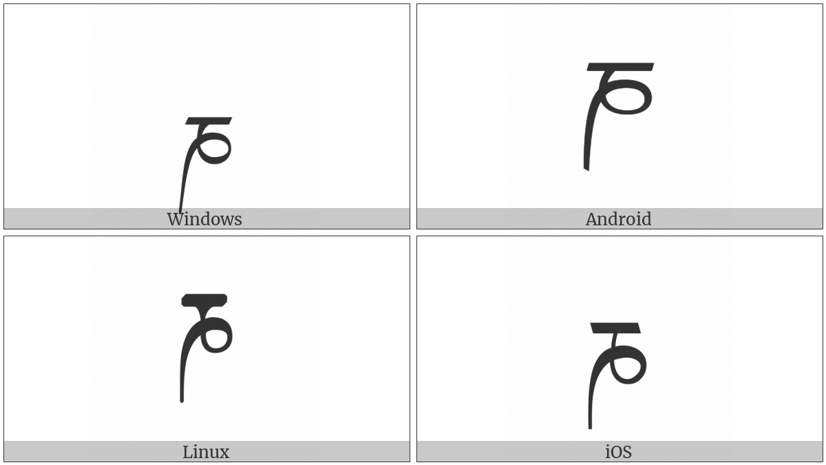The image below shows how the “Tibetan Letter Nna” symbol might look like on different operating systems. If the font in which this web site is displayed does not contain the symbol and there is no fallback font able to render it, you can use the image below to get an idea of what it should look like.