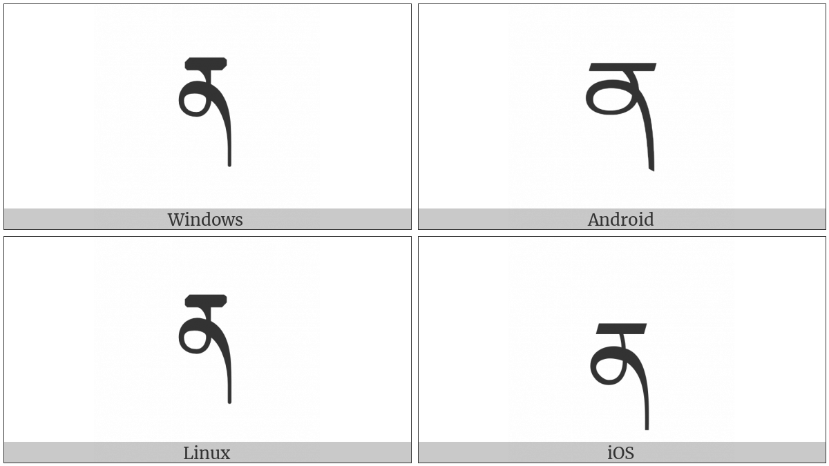The image below shows how the “Tibetan Letter Na” symbol might look like on different operating systems. If the font in which this web site is displayed does not contain the symbol and there is no fallback font able to render it, you can use the image below to get an idea of what it should look like.
