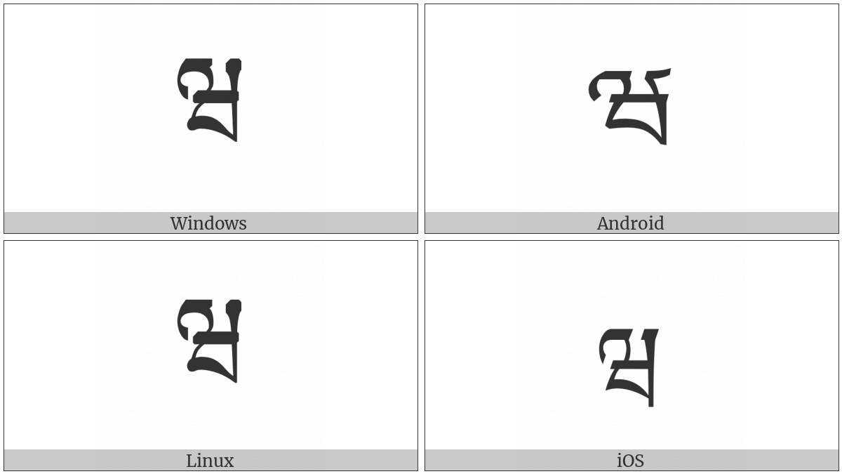 The image below shows how the “Tibetan Letter Wa” symbol might look like on different operating systems. If the font in which this web site is displayed does not contain the symbol and there is no fallback font able to render it, you can use the image below to get an idea of what it should look like.