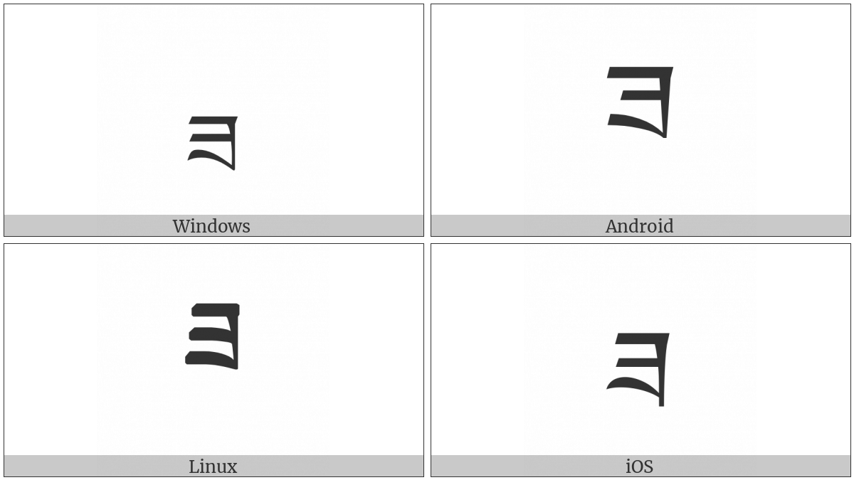 The image below shows how the “Tibetan Letter Za” symbol might look like on different operating systems. If the font in which this web site is displayed does not contain the symbol and there is no fallback font able to render it, you can use the image below to get an idea of what it should look like.