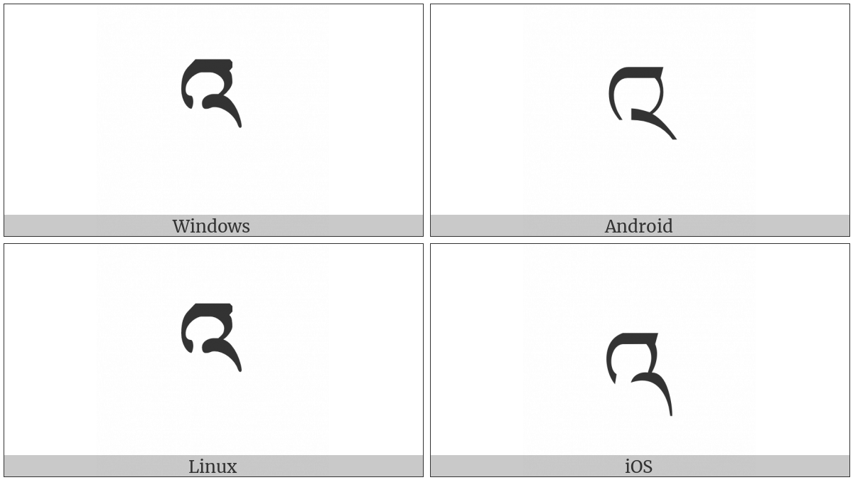 The image below shows how the “Tibetan Letter -A” symbol might look like on different operating systems. If the font in which this web site is displayed does not contain the symbol and there is no fallback font able to render it, you can use the image below to get an idea of what it should look like.
