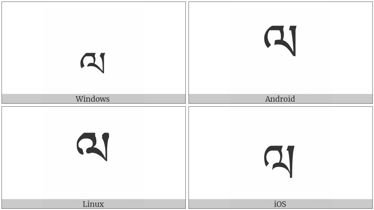 The image below shows how the “Tibetan Letter La” symbol might look like on different operating systems. If the font in which this web site is displayed does not contain the symbol and there is no fallback font able to render it, you can use the image below to get an idea of what it should look like.