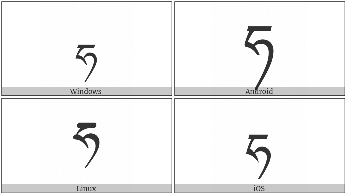 The image below shows how the “Tibetan Letter Ha” symbol might look like on different operating systems. If the font in which this web site is displayed does not contain the symbol and there is no fallback font able to render it, you can use the image below to get an idea of what it should look like.