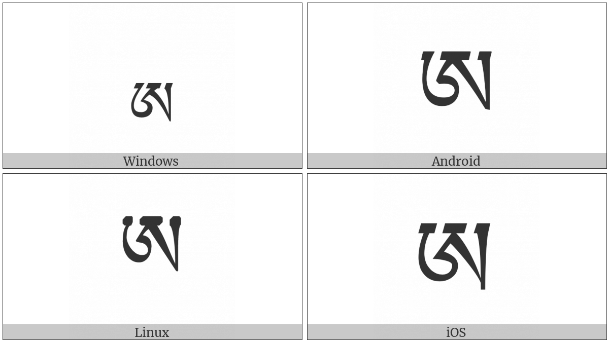 The image below shows how the “Tibetan Letter A” symbol might look like on different operating systems. If the font in which this web site is displayed does not contain the symbol and there is no fallback font able to render it, you can use the image below to get an idea of what it should look like.