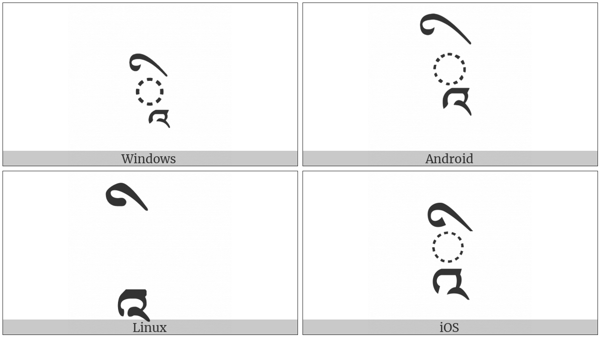 The image below shows how the “Tibetan Vowel Sign Ii” symbol might look like on different operating systems. If the font in which this web site is displayed does not contain the symbol and there is no fallback font able to render it, you can use the image below to get an idea of what it should look like.