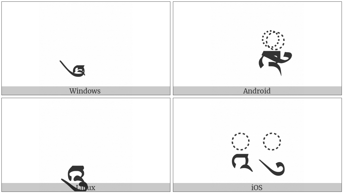 The image below shows how the “Tibetan Vowel Sign Uu” symbol might look like on different operating systems. If the font in which this web site is displayed does not contain the symbol and there is no fallback font able to render it, you can use the image below to get an idea of what it should look like.