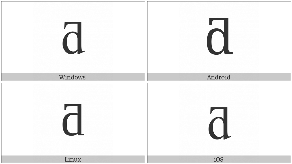 The image below shows how the “Latin Small Letter D With Topbar” symbol might look like on different operating systems. If the font in which this web site is displayed does not contain the symbol and there is no fallback font able to render it, you can use the image below to get an idea of what it should look like.