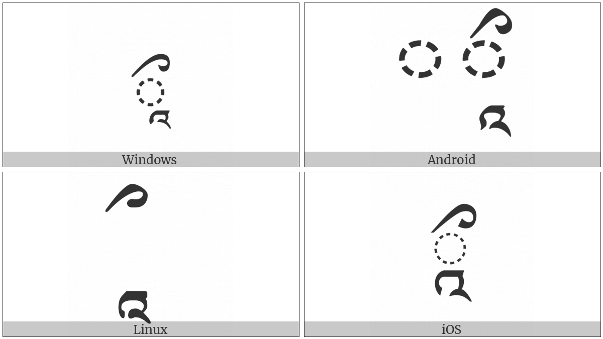 The image below shows how the “Tibetan Vowel Sign Reversed Ii” symbol might look like on different operating systems. If the font in which this web site is displayed does not contain the symbol and there is no fallback font able to render it, you can use the image below to get an idea of what it should look like.