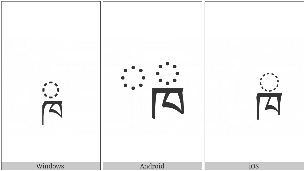 The image below shows how the “Tibetan Subjoined Letter Kha” symbol might look like on different operating systems. If the font in which this web site is displayed does not contain the symbol and there is no fallback font able to render it, you can use the image below to get an idea of what it should look like.