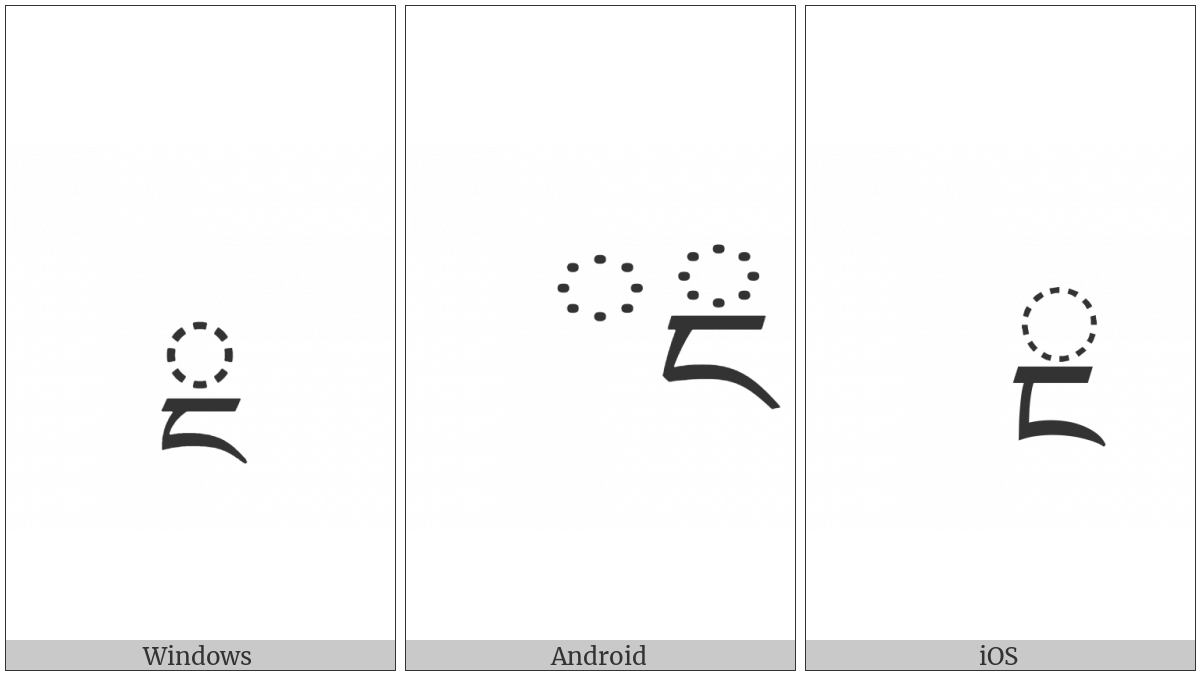 The image below shows how the “Tibetan Subjoined Letter Nga” symbol might look like on different operating systems. If the font in which this web site is displayed does not contain the symbol and there is no fallback font able to render it, you can use the image below to get an idea of what it should look like.