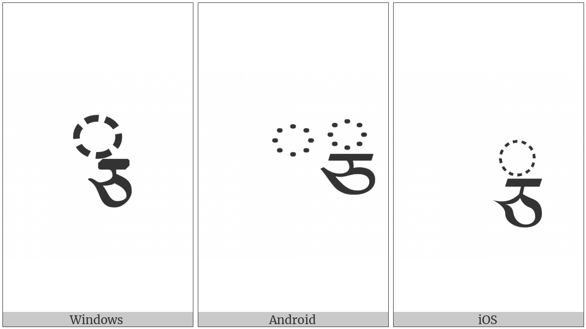 The image below shows how the “Tibetan Subjoined Letter Ca” symbol might look like on different operating systems. If the font in which this web site is displayed does not contain the symbol and there is no fallback font able to render it, you can use the image below to get an idea of what it should look like.