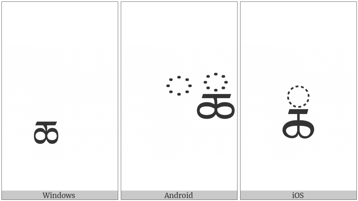 The image below shows how the “Tibetan Subjoined Letter Cha” symbol might look like on different operating systems. If the font in which this web site is displayed does not contain the symbol and there is no fallback font able to render it, you can use the image below to get an idea of what it should look like.