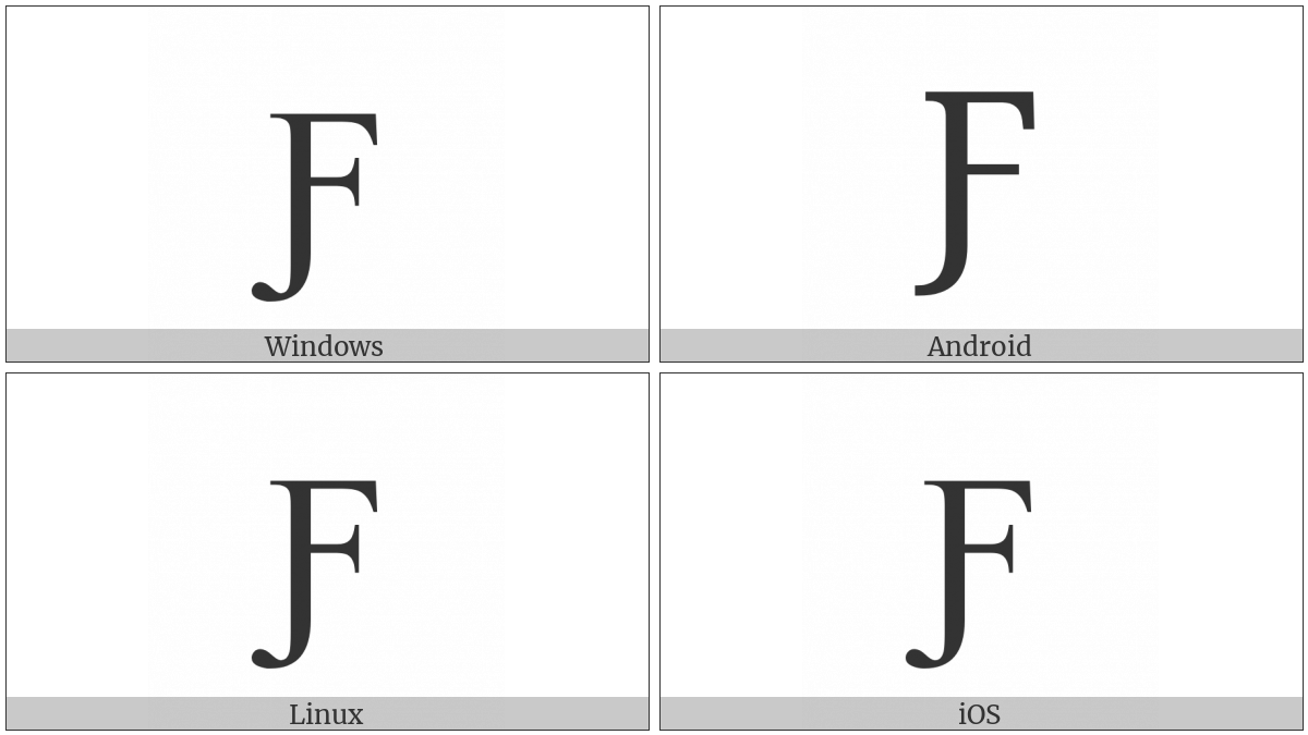 The image below shows how the “Latin Capital Letter F With Hook” symbol might look like on different operating systems. If the font in which this web site is displayed does not contain the symbol and there is no fallback font able to render it, you can use the image below to get an idea of what it should look like.
