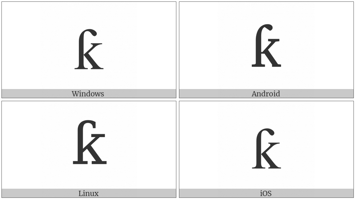 The image below shows how the “Latin Small Letter K With Hook” symbol might look like on different operating systems. If the font in which this web site is displayed does not contain the symbol and there is no fallback font able to render it, you can use the image below to get an idea of what it should look like.