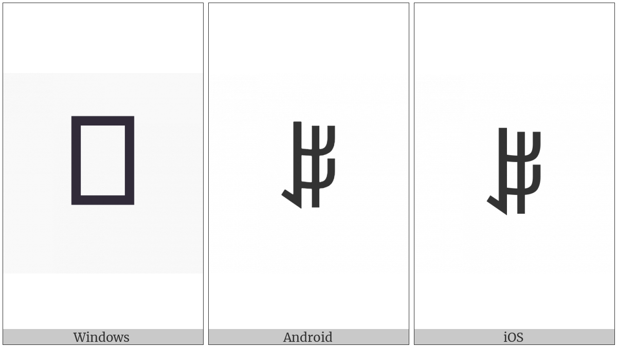 The image below shows how the “Yi Syllable Hlo” symbol might look like on different operating systems. If the font in which this web site is displayed does not contain the symbol and there is no fallback font able to render it, you can use the image below to get an idea of what it should look like.