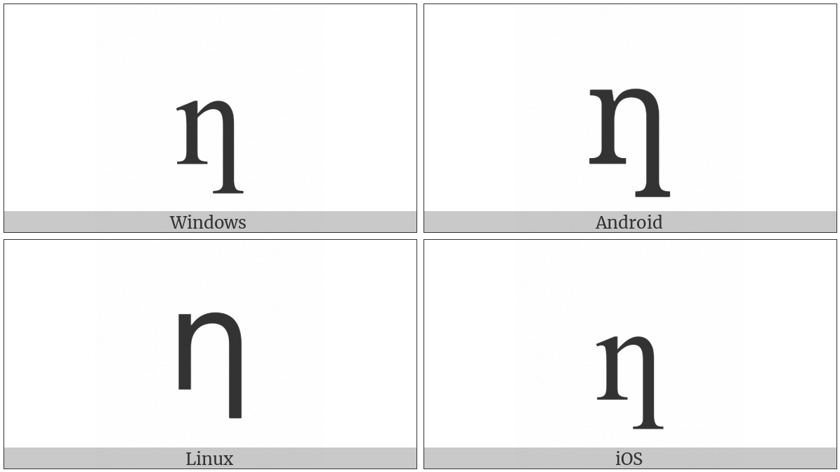 The image below shows how the “Latin Small Letter N With Long Right Leg” symbol might look like on different operating systems. If the font in which this web site is displayed does not contain the symbol and there is no fallback font able to render it, you can use the image below to get an idea of what it should look like.