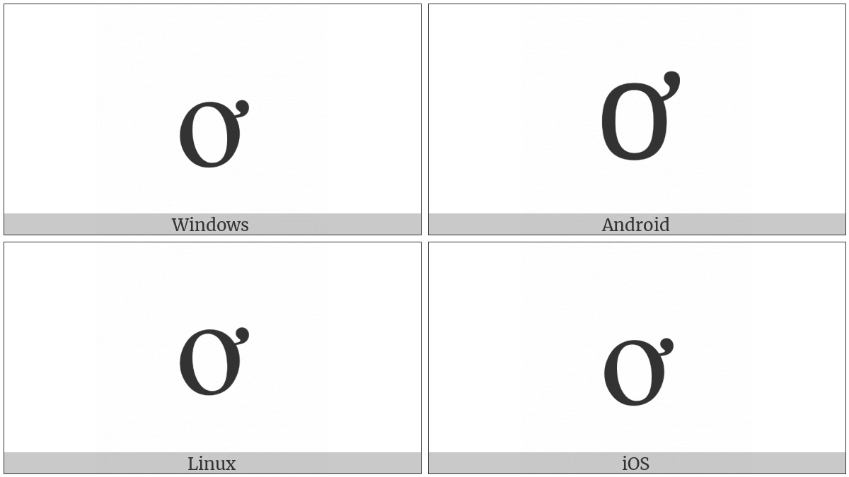 The image below shows how the “Latin Small Letter O With Horn” symbol might look like on different operating systems. If the font in which this web site is displayed does not contain the symbol and there is no fallback font able to render it, you can use the image below to get an idea of what it should look like.