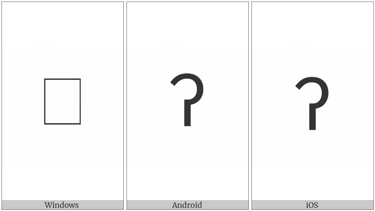 The image below shows how the “Bamum Letter Ntuu” symbol might look like on different operating systems. If the font in which this web site is displayed does not contain the symbol and there is no fallback font able to render it, you can use the image below to get an idea of what it should look like.
