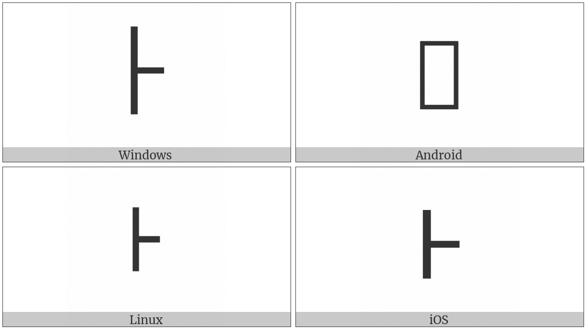 The image below shows how the “Modifier Letter Mid Left-Stem Tone Bar” symbol might look like on different operating systems. If the font in which this web site is displayed does not contain the symbol and there is no fallback font able to render it, you can use the image below to get an idea of what it should look like.